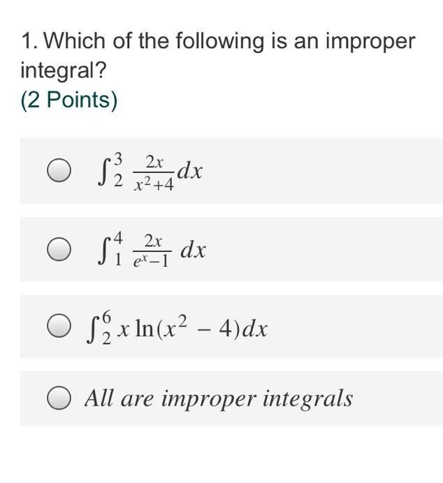 Solved 1 Which Of The Following Is An Improper Integral 2 Chegg Com
